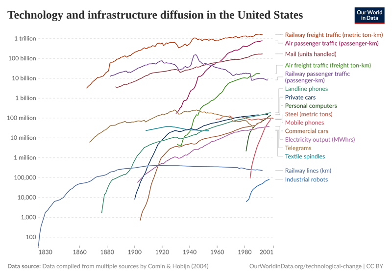 I googled “diffusion of different technologies” and found this paper. This image stood out to me: