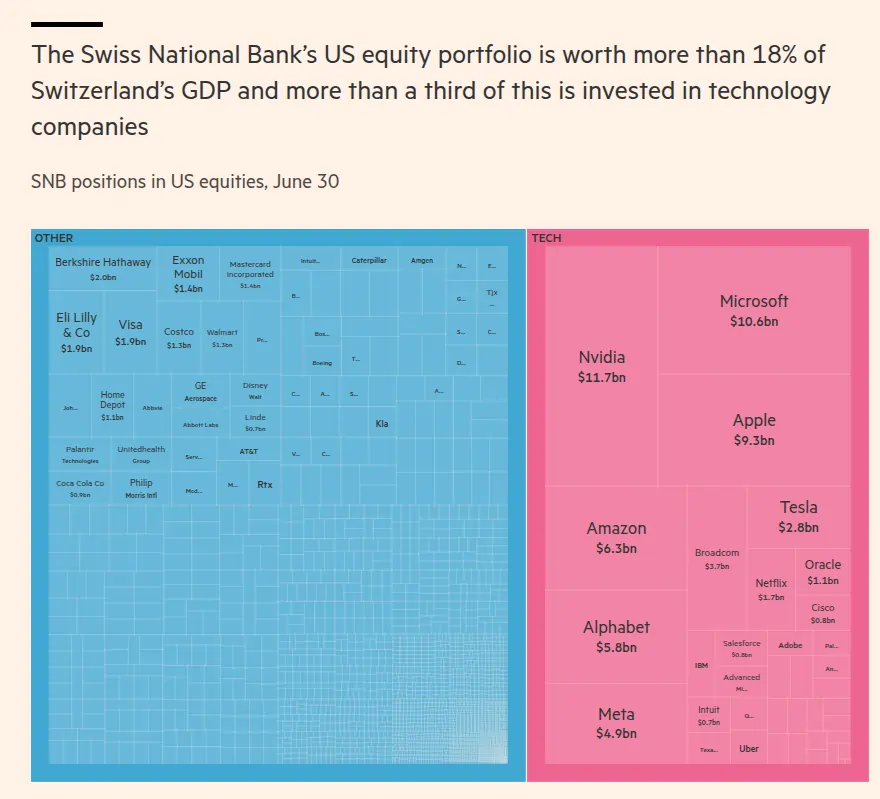The Swiss National Bank has US equity holdings amounting to $167bn, spread across more than 2,300 positions, according to SEC filings from June.