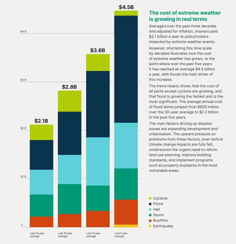 The cost of extreme weather is growing in real terms Averaged over the past three decades and adjusted for inflation, insurers paid $2.1 billion a year to policyholders impacted by extreme weather events. However, shortening this time scale by decades illustrates how the cost of extreme weather has grown, to the point where over the past five years it has reached an average $4.5 billion a year, with floods the main driver of this increase.